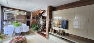 Pavimento inferior com living em 3 ambientes, porcelanato 1x1, teto rebaixado, armários, lavabo, cozinha ampla equipada com bons armários, área de serviço e dependência completa, 3 suítes com armários, sendo que a máster possui closet, split, sanitários bancada em mármore, armários e blindex.